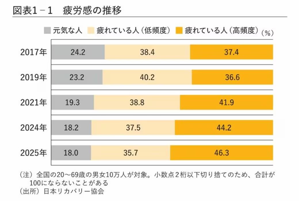 日本リカバリー協会のデータによると最新の2025年疲労感調査では82.0%となり、過去最高を更新しました。この82.0%という割合を総務省統計局の人口推計(20〜79歳)をもとに換算すると7172万人となり、2024年の7143万人と比べ30万人も増えたことになります。